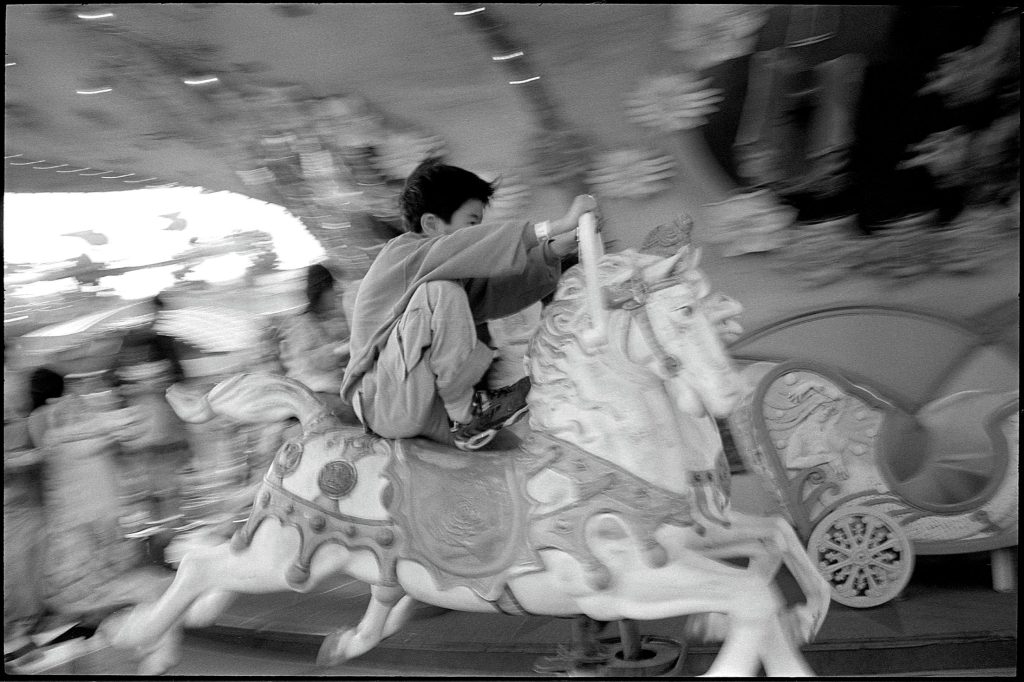 神奈川県・川崎市に2002年3月まで存在していた向ヶ丘遊園地での光景を、1990年代末から閉園する日まで撮影し、そこに集う人々の姿をテーマにした作品です。地域のアミューズメントパークとしての園内には、昭和の雰囲気が残る懐かしい乗り物や遊具、手作り感のあるアトラクションなどが用意されていました。